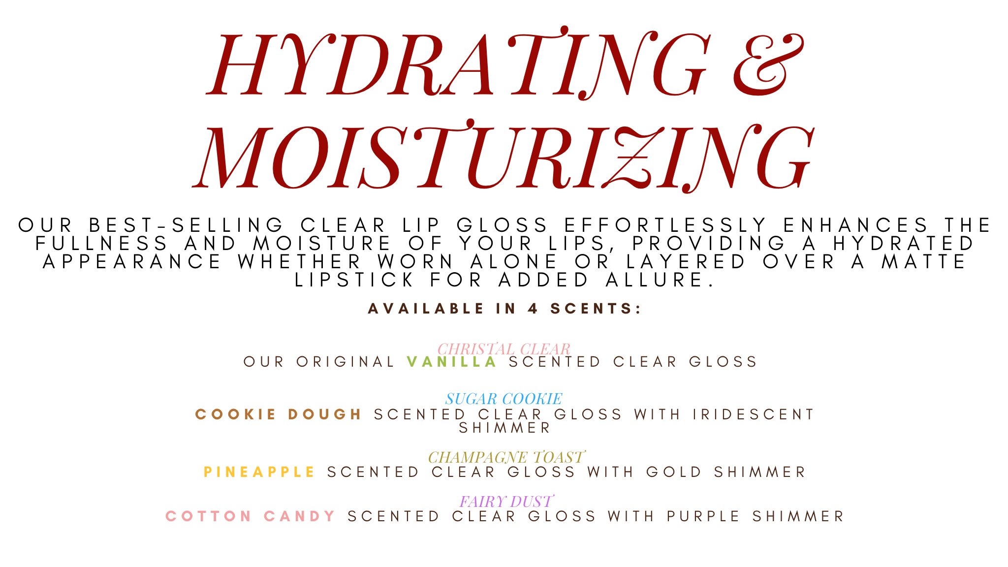 Our Vanilla scented clear lip gloss has a smooth texture that leaves your lips plumped and hydrated. This hydrating lip gloss can be used alone to enhance your lips natural color when alone or be used as a top coat to any matte lipstick providing a hydrating finish.