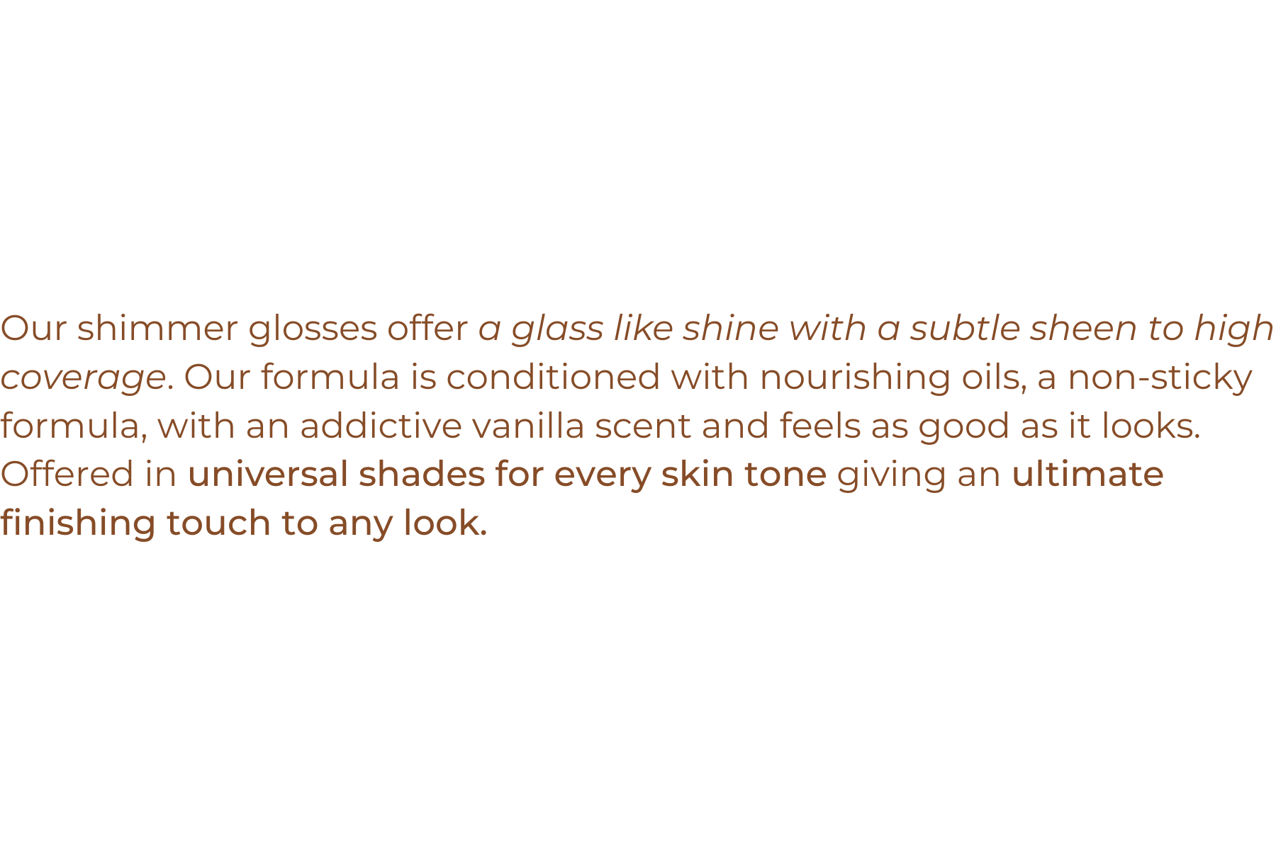 This shimmering brown gloss offers a glass like shine with a subtle sheen to high coverage. Our formula is conditioned with nourishing oils, a non-sticky formula, with an addictive vanilla scent and feels as good as it looks. This collection offers 4 universal shades for every skin tone giving an ultimate finishing touch to any look.